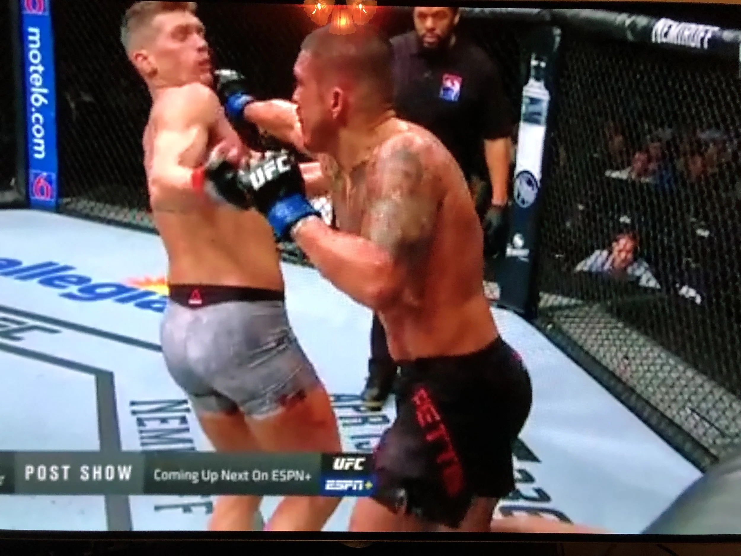 Round two was more of the same, Pettis moving forward but Thompson landing more accurately. Thompson kept him at distance with his kicks which opened up the shots down the pipe with his hands. It looked like it was going to be another round for Thompson, but out of nowhere Pettis takes a step back and then springs forward with a superman punch, it sends Wonderboy to the canvas, his head bounced off the canvas and Pettis follows it up with two more punches to a already unconscious Thompson. The fight is over at 4:55 of the second round!